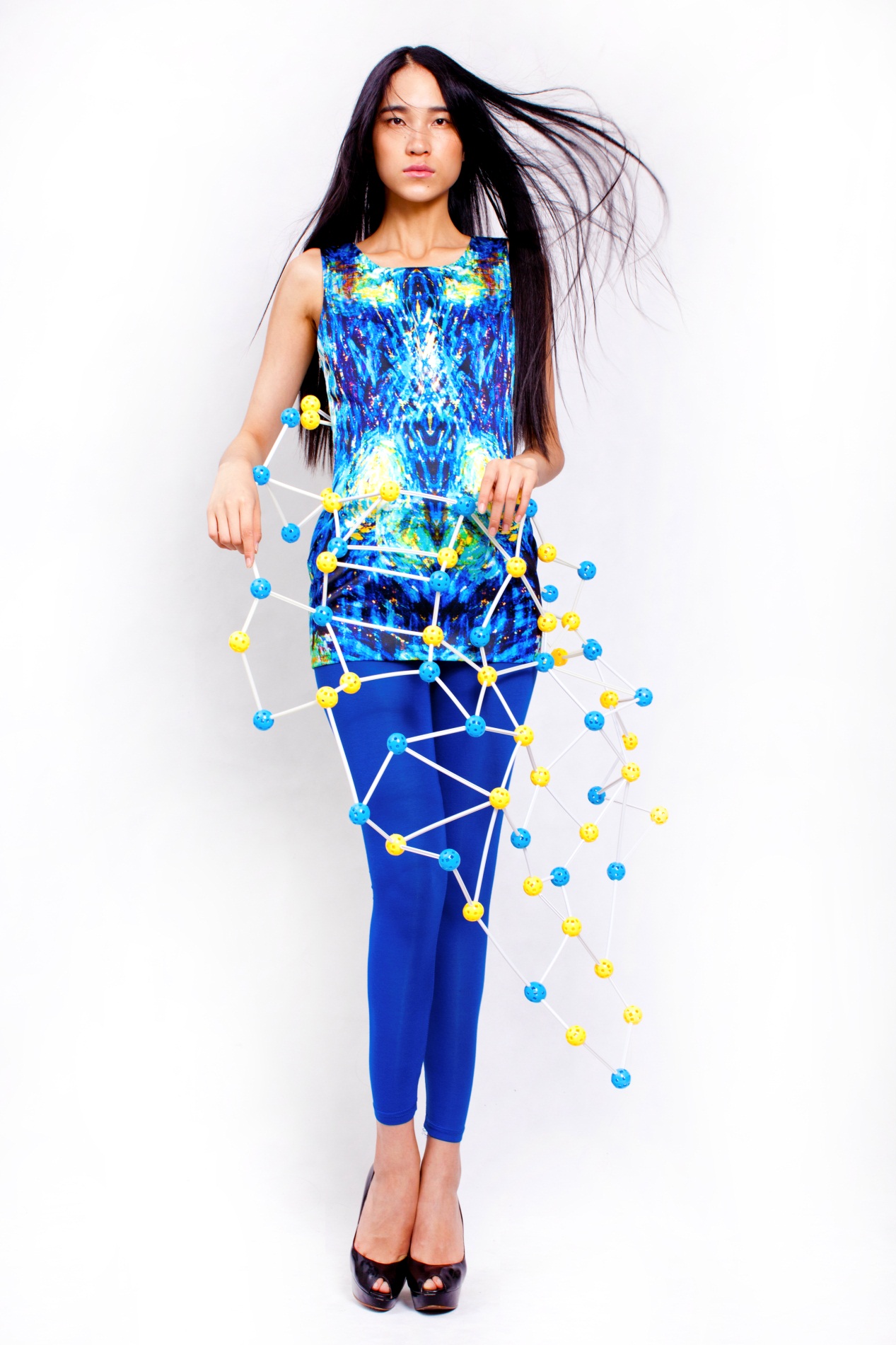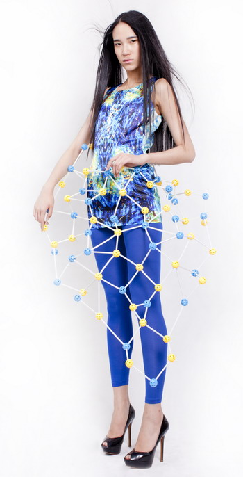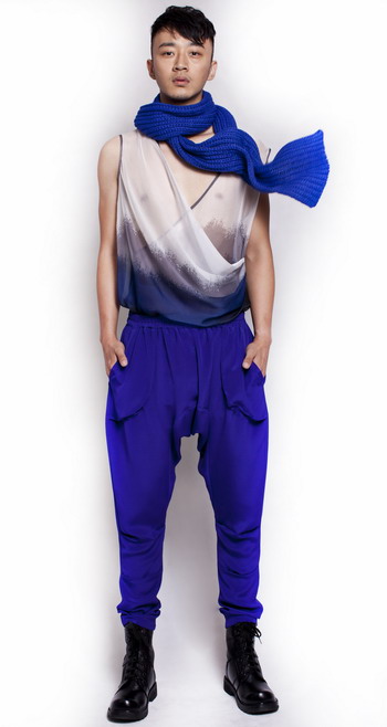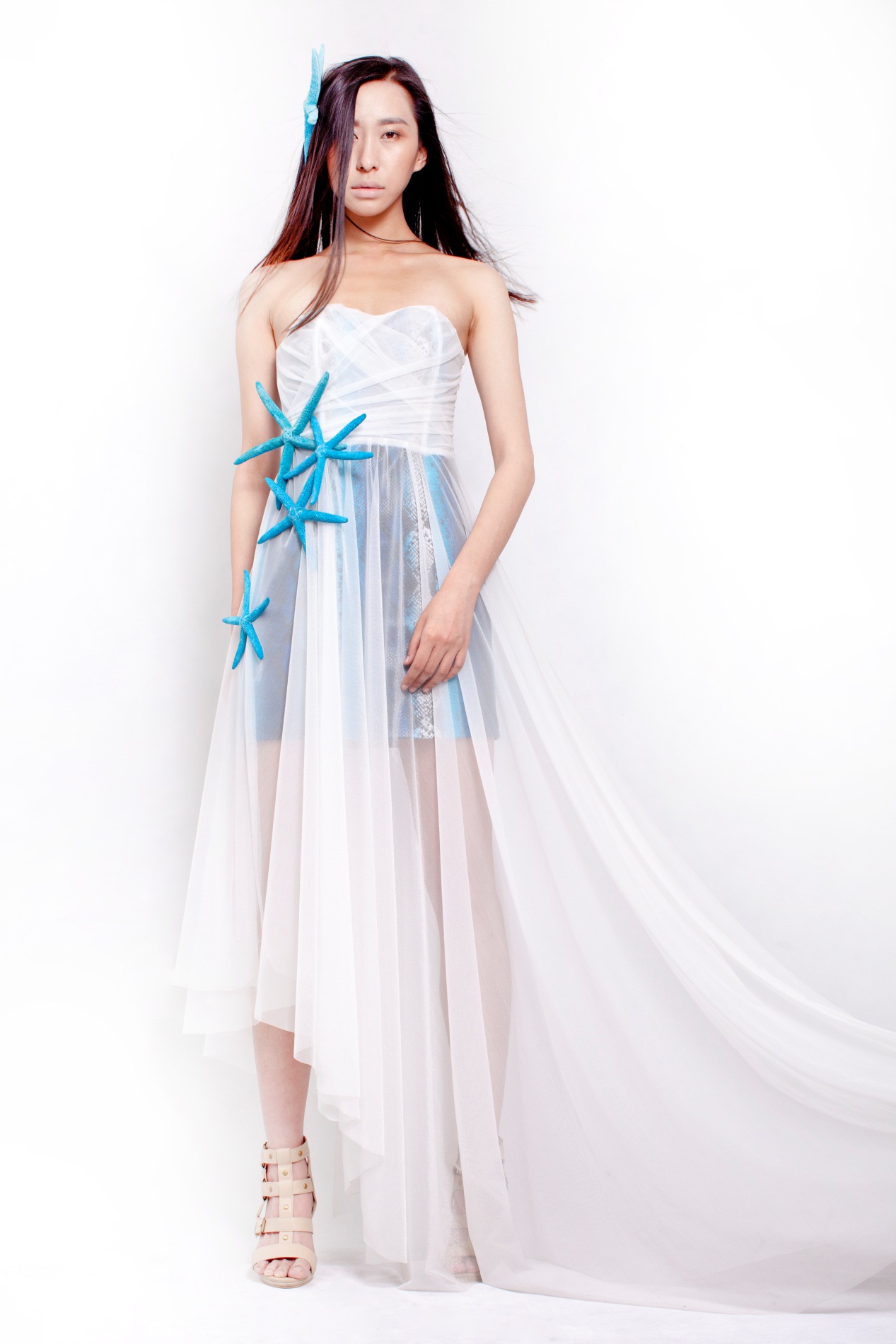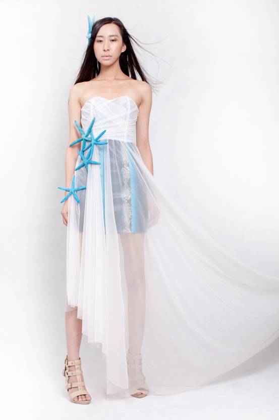 在设计过程中,黄陆闽泓联想到人类过度开采石油,投放白色污染,导致海洋出现大量垃圾和泡沫,引起污染。所以在她的设计中,加入了海星、贝壳等海洋生物,希望通过服装作品来呼吁全人类保护环境的美好愿望。在设计色彩上,采用蓝白色底色,使得衣服展示时,引起人们对于大海的联想。