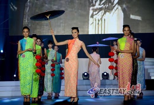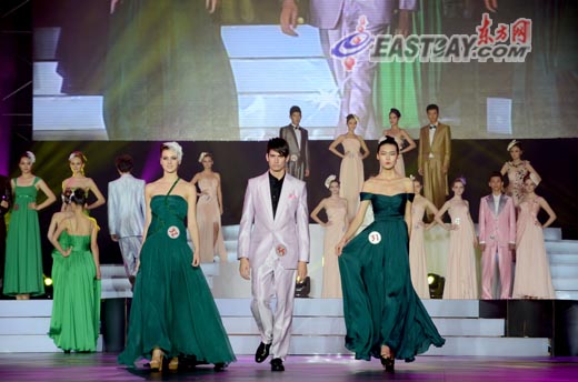 图为冠亚季军登台领奖(左一为学生女模丁柔尹) 图为选手进行泳装展示 图为选手进行旗袍展示 图为选手进行晚装展示