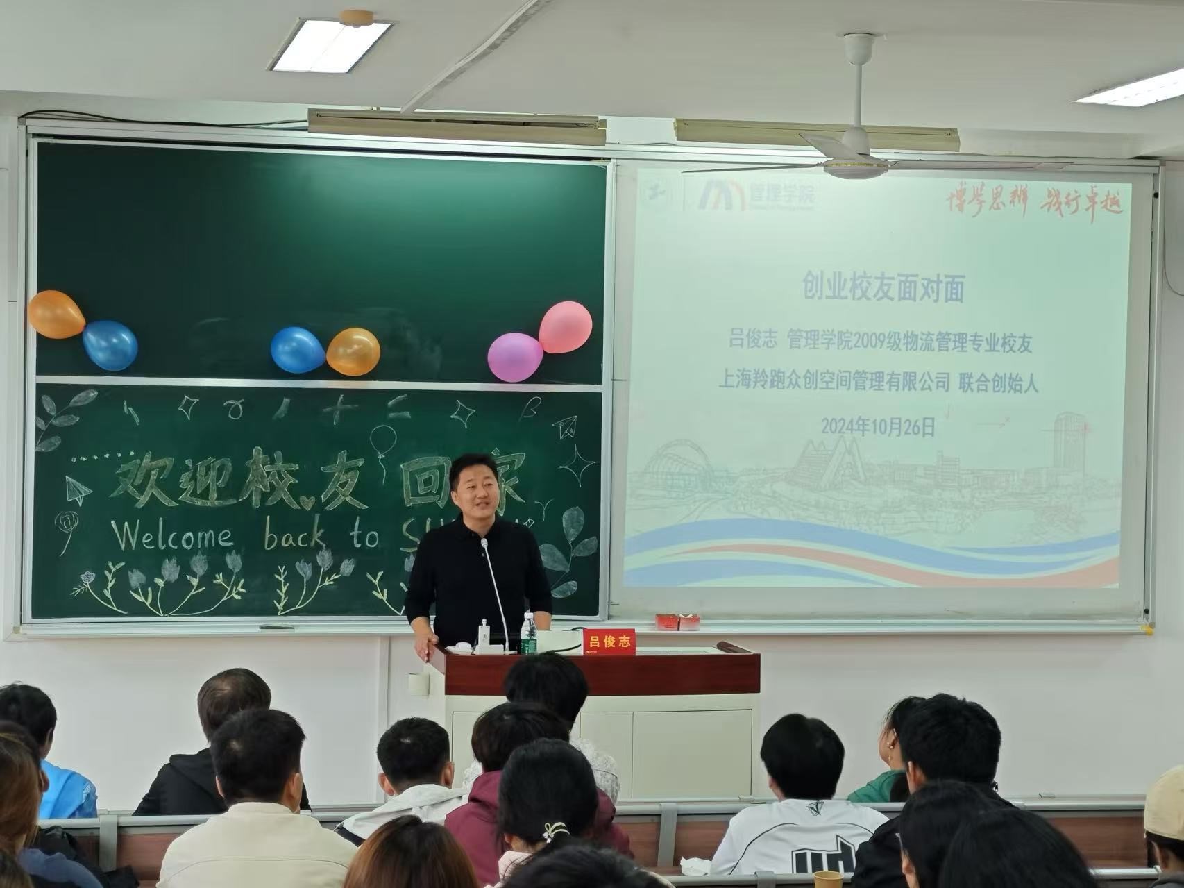 “菁”彩创业——创业校友面对面。活动邀请了管理学院2009级物流管理专业校友、上海羚跑众创空间管理有限公司联合创始人吕俊志作分享。他强调大学生要明确目标,积极参与名企实习,随后介绍了创业的关键要素、过程中会遇到的挑战,建议创业者寻求指导和资源。