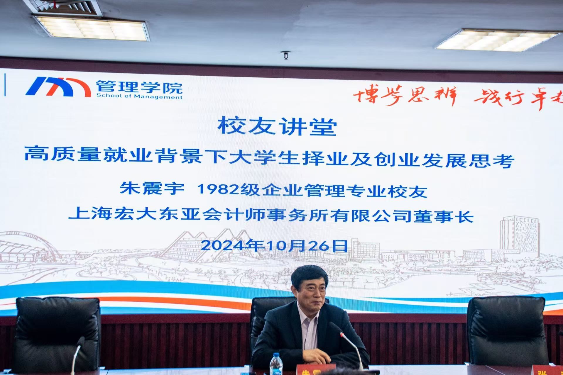 “菁”管起航——校友讲堂。讲堂由学院1982级企业管理专业校友、现任上海宏大东亚会计师事务所有限公司董事长朱震宇主讲。他提出职场发展的四大要点:一是以德为先,踏踏实实做事;二是勇于挑战,敢于做有挑战性的工作;三是中庸之道,做好为人处事;四是提高能力,不断学习。