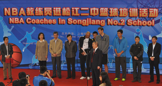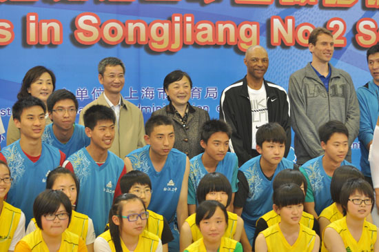 上海市体育局领导、克莱蒙德一行与小球员合影