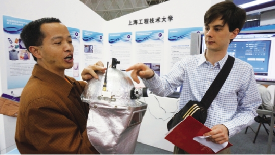 在昨天开幕的科博会上,来自全国各地的高校和科研院所“亮”出了自已开发的尖端科技产品,开展项目对接。图为上海工程技术大学开发的防火多功能消防救援帽吸引了一名美国专家的目光,双方进行了深入交流。 原文链接: 搜狐网:http://roll.sohu.com/20130525/n377012488.shtml