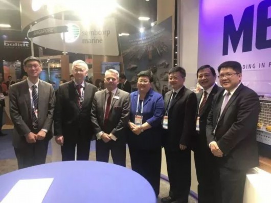汪泓书记、张小松主任、张林副主任、史健勇副校长、王友农董事长在Seatrade UBM总裁安德鲁陪同下参观展会