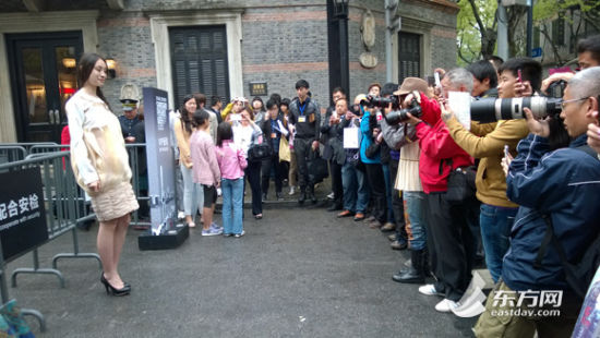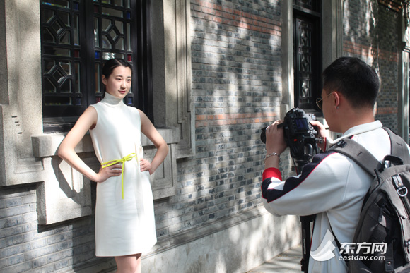 东方网记者刘歆4月17日摄影报道:石库门的标志性建筑前,身着艳丽服装的模特,还有手持单反的学生们,更有前来感受时尚气息的群众……日前,上海工程技术大学中法埃菲时装设计师学院的数十名学生,将是装设计秀和摄影实践课程搬到了上海时装周的秀场外。