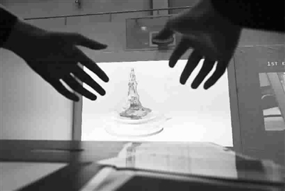 这项多媒体作品取名“律动青花”:用手轻按触摸屏,眼前的大屏幕上,青花瓷拉坯塑形、烤制、花纹贴图等制作环节一一展现出来。