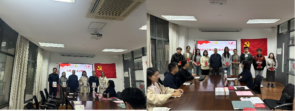 张海成老师为新任党支部书记赠书,为新党员赠送《中国共产党章程》,并与朱君璇书记共同领学《中国共产党章程》。