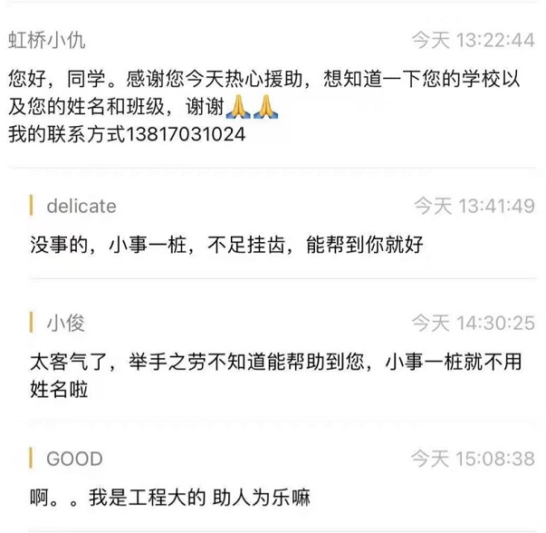 4月2日上午,仇欣同志由于家人急需用血来到松江区血站申请用血,由于用血单必须由现金或银行卡支付,仇欣同志身上未携带现金,向当时正在松江区血站献血的上海工程技术大学同学求助,希望通过微信或支付宝转账换取现金。刚参加完献血的机械与汽车工程学院刘明灏、程林涵、孙世轩、谭俊四名同学热心伸出援手,最后仇欣同志成功筹得现金920元。事后,仇欣同志联系四名同学表达感谢并希望赠送锦旗,但刘明灏等人表示这只是“举手之劳”“小事一桩”“能帮到你就好”,并未透露自己的信息。最终,仇欣同志联系学校,表示“这样的事迹值得被宣扬,感恩遇见所有善良的人”。