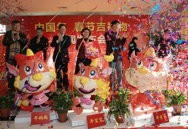 领衔该设计的中国著名设计师方芳表示,“中国年•春节吉祥物”是在复旦大学、上海工程技术大学等高校的共同参与下,由政府、学界、企业联合组成精干专业设计团队,经历了长达三年潜心研究与设计,百易其稿确立的。