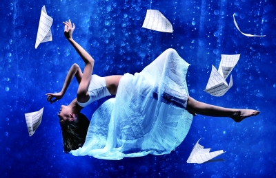 《蔚蓝之舞》整组作品讲述的都是女性与水的共舞。这里有一层寓意:水代表环境,而舞者是女性,女性得到了环境的认可,水中的气泡就是环境对舞者的呼应。我想要表达的是,当女性全身心地投入一件事情时,她的情感与力量将得到自然的鼓舞。这幅舞者悬浮的照片是组照的尾声,在画面中加入乐谱,是因为我认为舞者是天生的音乐家,在音乐的感染之下,她将女性之美表达得淋漓尽致。