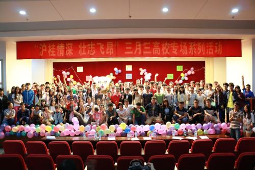 抢绣球过后,会场放起《我相信》的音乐,所有嘉宾、工作人员、志愿者以及观众齐聚舞台一起合唱留影,宣布了第五届广西三月三民俗活动高校专场全部结束。