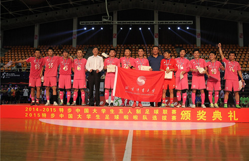 2014-2015赛季特步中国大学生五人制足球联赛由中国大学生体育协会、中国足球协会联合主办,中国大学生体育协会足球分会协办,特步独家冠名,虎扑独家推广。中国大学生体育协会专职副主席王钢、北京体育大学党委书记杨桦、北京体育大学校长池建、特步(中国)有限公司品牌首席执行官李冠仪等到场观看比赛。赛事推广大使、国际知名球星舍甫琴科现场助阵,与美女拉拉队员、人气球队经理欢乐互动,让座无虚席的北体大体育馆内人气爆棚。