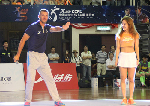 自2012-2013赛季至今,特步中国大学生五人制足球联赛便以“玩转我的赛场”为品牌理念,本赛季又喊出“该我上场”的口号,鼓励场内场外的所有参与者展现青春活力、释放阳光能量。无论球员、拉拉队队员、球队经理、球迷观众都能“上场”,成为万众瞩目的焦点。作为特步大五联赛的姊妹比赛,2014-2015赛季特步中国大学生足球拉拉队选拔赛总决赛也于当晚同步进行。贯穿整个赛季的“我是球队经理”活动也在比赛当天达到了高潮,四川赛区校园组冠军西南交通大学的美女经理谢轩悄然来到现场,并与舍瓦互动,成为当晚的一大惊喜。虽然球队尚未打进总决赛,但谢轩和五人制足球的故事打动了万千网友。她坦言,希望未来有更多的同龄人关注这项运动,“特别是女生,这样经理姐妹团就更壮大了”。