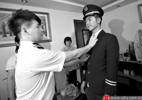 工程大飞行学院党总支书记何法江郑重地将红艳艳的录取通知书交到曹思铭的手上,东航招聘管理部副经理陈强则为曹思铭授予象征着“准飞行员”的飞行员制服及飞行员帽子。1米82的身高,让他穿上制服后更显帅酷与阳光。“《冲上云霄》里面的机长就是我的偶像。”曹思铭开心地说。