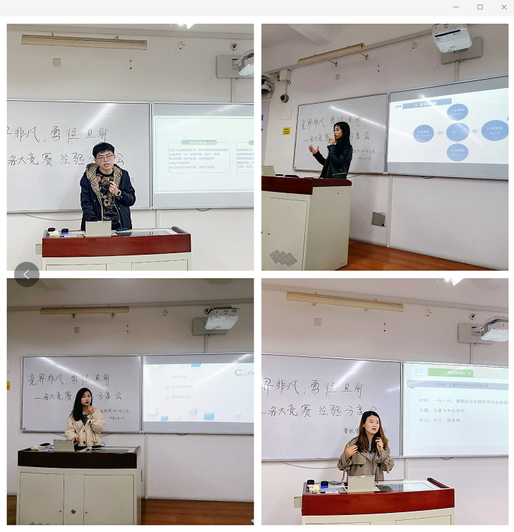 为激发同学们参加竞赛的热情,提升研究生创新实践能力,更好提升研究生双创项目的培育成果,管理学院研究生会于4月13日下午在教学楼D306举办了竞赛专题经验分享会。活动邀请到管理学院2018级工商管理二班的汪媛媛同学、2019级工商管理三班的韩婷俐同学、2019级工商管理一班的仲崇宇同学和2019级社保一班的姚佳伟同学。他们根据自己的参赛经验,向大家详细分享了参赛的成功经验。通过近两个小时的分享交流,同学们受益良多。