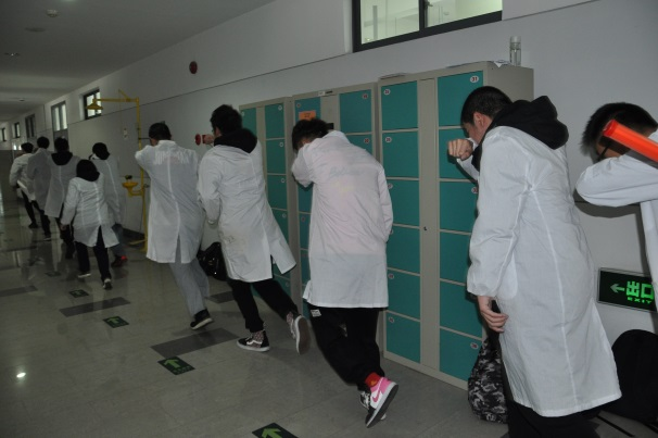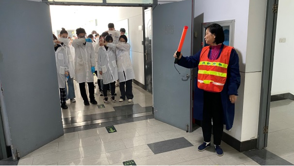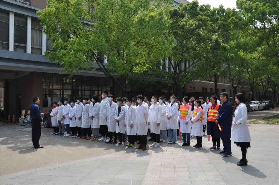 演练在实训楼3号、4号楼同时开展。设定3318实验室发生了可燃气体报警器报警,4号楼的联动报警同时触发,初步判定为可燃性化学试剂泄漏,并存在进一步引发火情的风险。学院接报后,立即启动应急疏散预案,由学院实验室教师组成的应急处置小组组织正在开展的无机化学、有机化学、物理化学本科教学实验室的学生进行紧急疏散。共计95名学生,按照预先制定的逃生路线,在应急处置人员、安全引导员指引下,迅速、有序地从就近消防楼梯下楼,向楼外集合点撤离。参加活动的全体师生积极配合圆满完成了消防疏散演练活动,所有参加演习的师生在5分钟内安全撤离到指定地点,达到了预期的效果。
