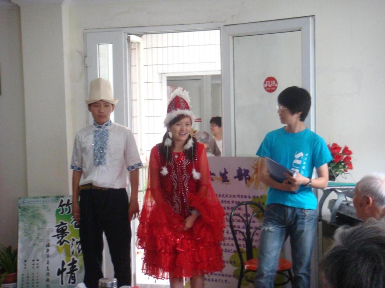 早上9:15,同学们带上粽子、营养品和水果来到了敬老院。敬老院的院长和老人们共同欢迎同学们的到来,同学们在房间里为老人们表演一个个自己编排的节目。维吾尔族的姑娘们带来了她们民族的特色舞蹈和歌曲,让现场的气氛渐渐活跃了起来。老人们也拿出了他们的拿手节目为大家表演,其他同学也不甘示弱,纷纷为老人们献上自己的绝活,蒙语歌、韩语歌、B-Box……老人们虽不能理解歌曲的字面意思,但是在他们的脸上还是浮现出了开心的笑容,最后所有人以大合唱《北京的金山上》结束了表演,开始与老人们自由交谈。同学们拿着自己带来的粽子、营养品和水果分发到老爷爷老奶奶们的手里,向他们送上了端午节的祝福。 | |