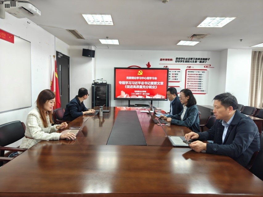 11月15日上午,马克思主义学院党委在行政楼1112会议室召开党委理论学习中心组集体学习,专题学习习近平总书记发表的重要文章《促进高质量充分就业》。学院党委委员、宣传员参加学习,会议由学院党委书记董旖旎主持。