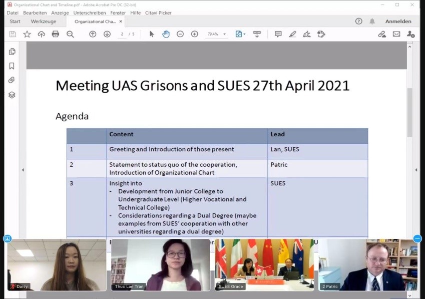4月27日下午,我校与瑞士格劳宾登应用科学大学就中瑞合作办学项目提升办学层次等议题进行视频会议。高职学院院长、中瑞合作办学项目主任沈勤,国际合作与交流处副处长肖谦,管理系主任袁建昌、副主任黄欣懿、项目翻译王阳参会;格劳宾登应用科学大学国际事务合作处长Andreas Deuber、旅游学院教务长 Patric Arn 、项目主管Thuc Lan Tran参会。