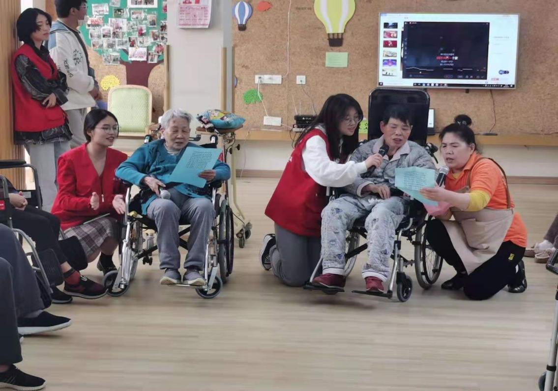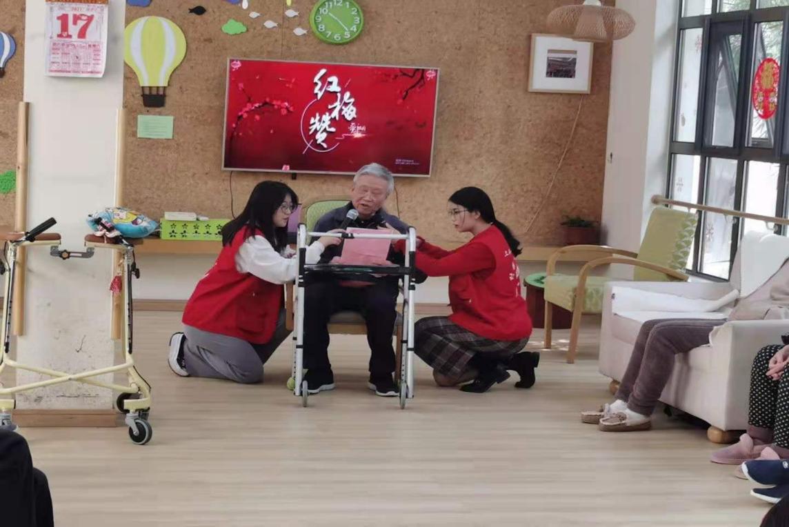 早上8点,学生一行二十余人从学校出发前往敬老院。一到敬老院志愿者们就开始表演准备好的节目,有朗诵诗歌、唱红歌等,敬老院的老人们也一起参与表演,《红梅赞》《大中国》一首首经典的红歌里唱出浓浓的爱党情和深深的爱国心。分享故事环节,志愿者与老党员们热烈互动,交流自己的入党心得和故事。