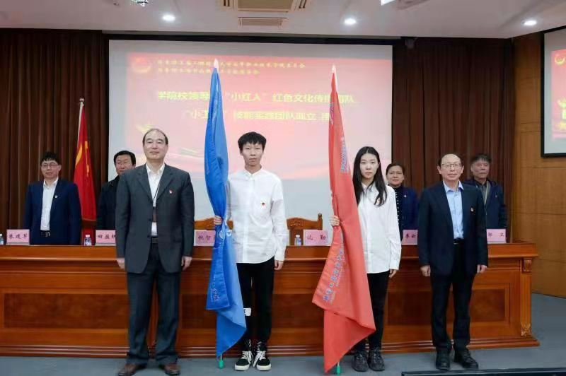 党委书记倪智勇,党委副书记、院校长沈勤为“小红人”红色文化传播团队、“小工匠”技能实践团队成立授旗。