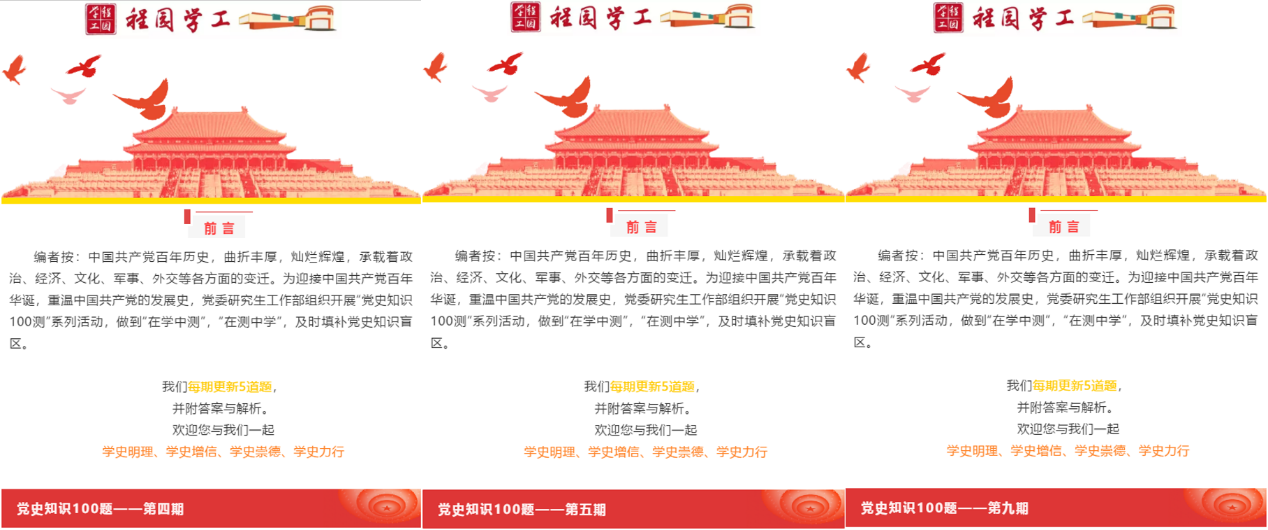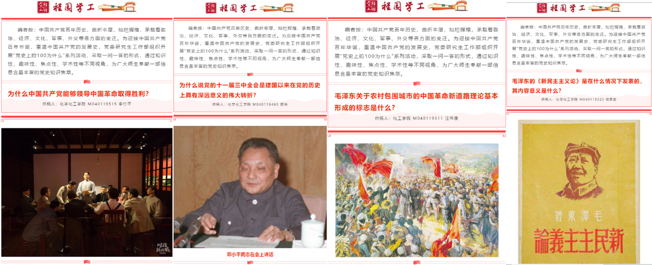 研究生积极分子、共青团员解析党史。通过查阅大量历史资料,挖掘中国共产党历史进程中的“为什么”,采取问答形式,从知识性、趣味性、焦点性、学术性等不同视角,解析党史知识。
