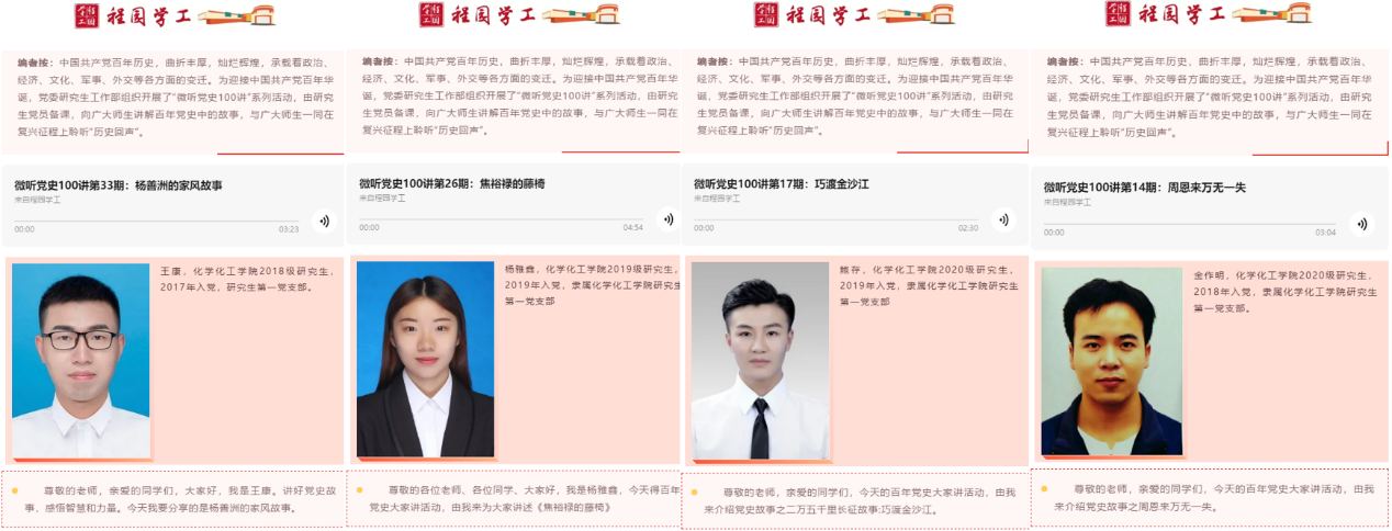 研究生党员讲述党史故事。化工学院标杆支部、研究生第一党支部全体共产党员通过录制音频,配以图文,形成推文,发布于程园学工公众号的形式,借助网络思政途径,引导全体研究生学史明理、学史增信、学史崇德、学史力行。