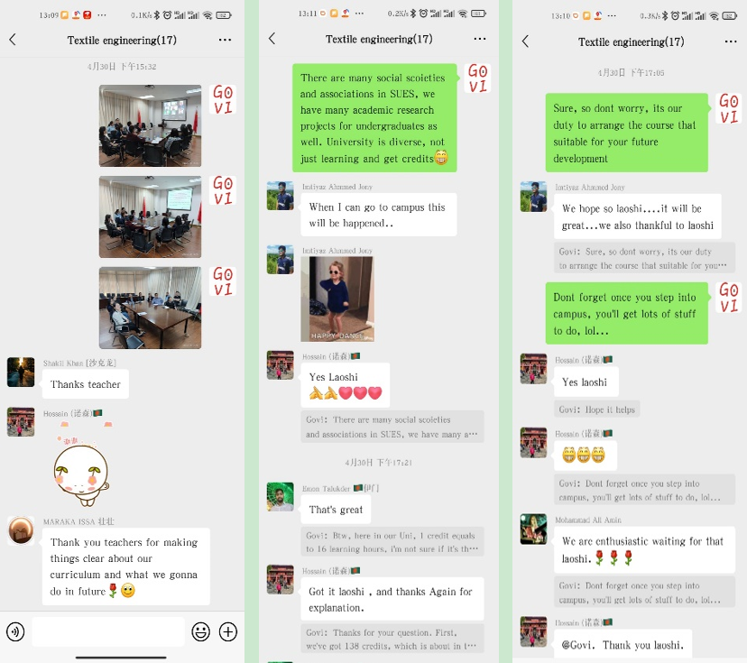 本次见面会成果显著,在国际教育学院的积极组织和纺织服装学院领导的充分重视下,纺织工程系有近半数的老师参加见面会,国际学生们积极参与线上会议的讨论,会后同学们还在专业微信群(Textile Engineering)里就自己感兴趣的其他问题与老师们进行了长时间和深入的沟通,同学们纷纷表示,见面会让他们感受到学校学院大家庭的温暖,对校园生活充满了期待,对专业学习有了更大的兴趣,为今后的学习规划提供了明确的方向。