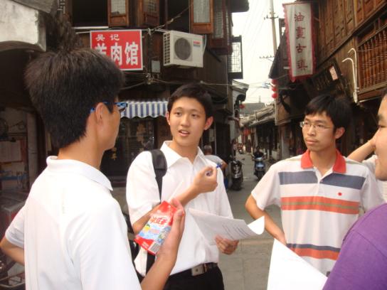 新场当地的建筑是以灰派建筑风格为主,但由于民国时期和解放后的一段时期受到过不同程度的破坏,因此呈现在大家面前的已是一幅残缺不全的景象。 进入虹西街,大家便开始实地考察社会主义新农村建设情况及农村精神文明建设情况。他们分别就生活状况、业余活动和新闻实事关注情况与当地村民进行了热烈的讨论。在深入的交流过后,学生们参观了虹西街上的清风茶楼,茶楼内的清代遗留物品成了学生们追捧的焦点。 当地的评弹同样吸引人,虽说不一定比得上苏州评弹,但也可以称得上上海遗留文化中最有特色的项目之一了。当地的居民向大家介绍,这里几乎每周都会有公益演出,而他们也听得乐此不疲。 夜幕很快就降了下来,同学们怀着感激与感慨离开了新场镇。 | |