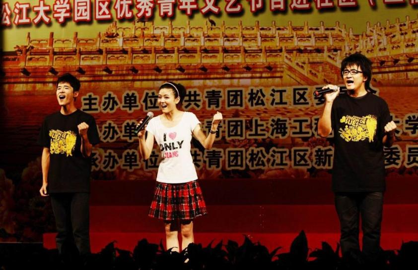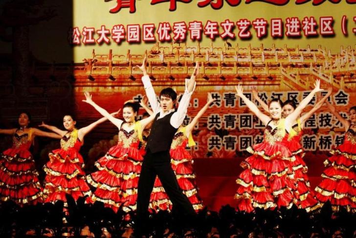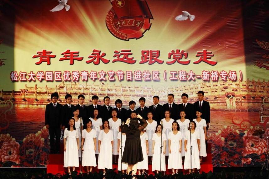 |  2009年9月10日,18:30,在新桥镇影剧院顺利举办了第七场“青年永远跟党走”松江大学园区优秀青年文艺节目进社区文艺演出。前来观看此次演出的领导有:中共新桥镇委员会副书记沈英,共青团松江区委员会副书记陈佳楠,中共新桥镇委员会委员邱建强,中共新桥镇员会委员丁永兴。此次文艺演出由上海工程技术大学主办,上海工程技术大学社团联合会承办,新桥镇团委会协办。 今年正值祖国六十华诞,因此整场演出以青年人的成长为主线,以青年人拥有的奋斗、奉献与拼搏精神为副线。将青年人对祖国六十华诞的祝福与对明年世博成功举办的期望穿插其中。  演出一开始,由工程大舞蹈团的女生们带来的一曲开场舞《请到这里来》充满了青年人的活力与朝气,一下子便将场下的气氛带动了起来。而中共新桥镇居委会小朋友们献上的少儿舞蹈《兰色的梦》则让在场的观众们感受到了孩子的天真与童趣。这样天真快乐的童年我们也曾拥有过。当岁月将我们的这份童真悄悄带走后,它却让我们听懂了年轻的歌声,一种负载着久远期待的声音。蓝手乐队的歌曲联唱,便唱出了年轻最初的声音。 接下来由工程大艺术团同学表演的世博诗歌朗诵《世博 城韵》和世博歌曲联唱《城市,让生活更美好》则让在场的观众们感受到青年一代对于世博顺利召开的美好寄愿。