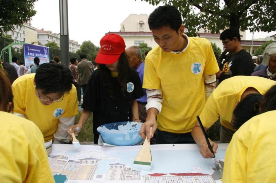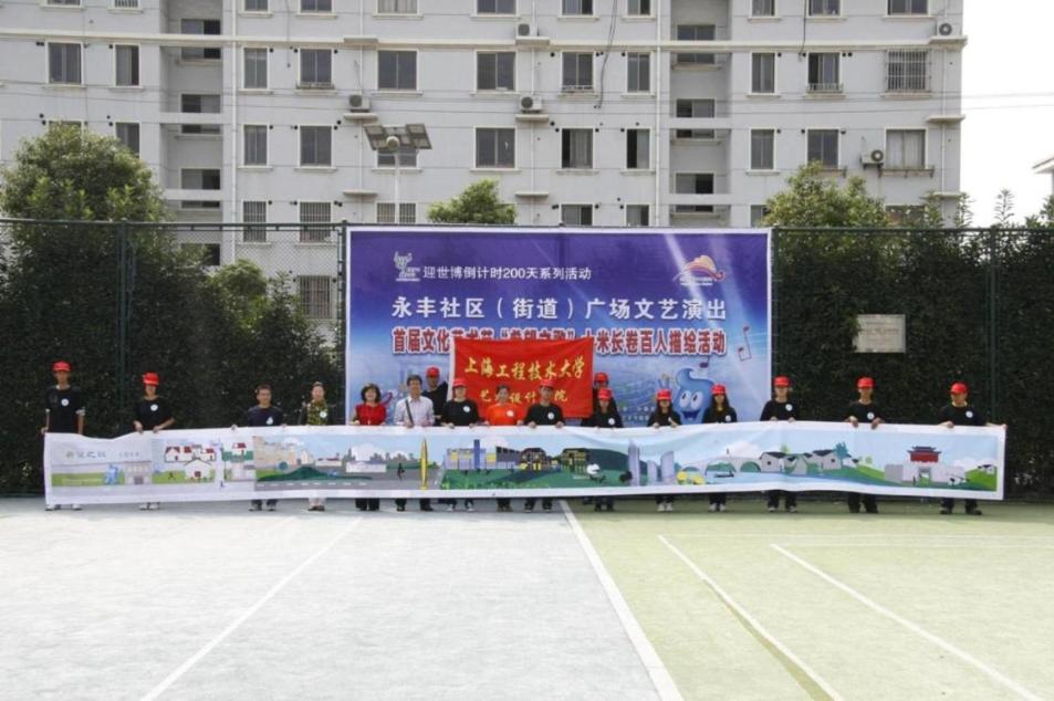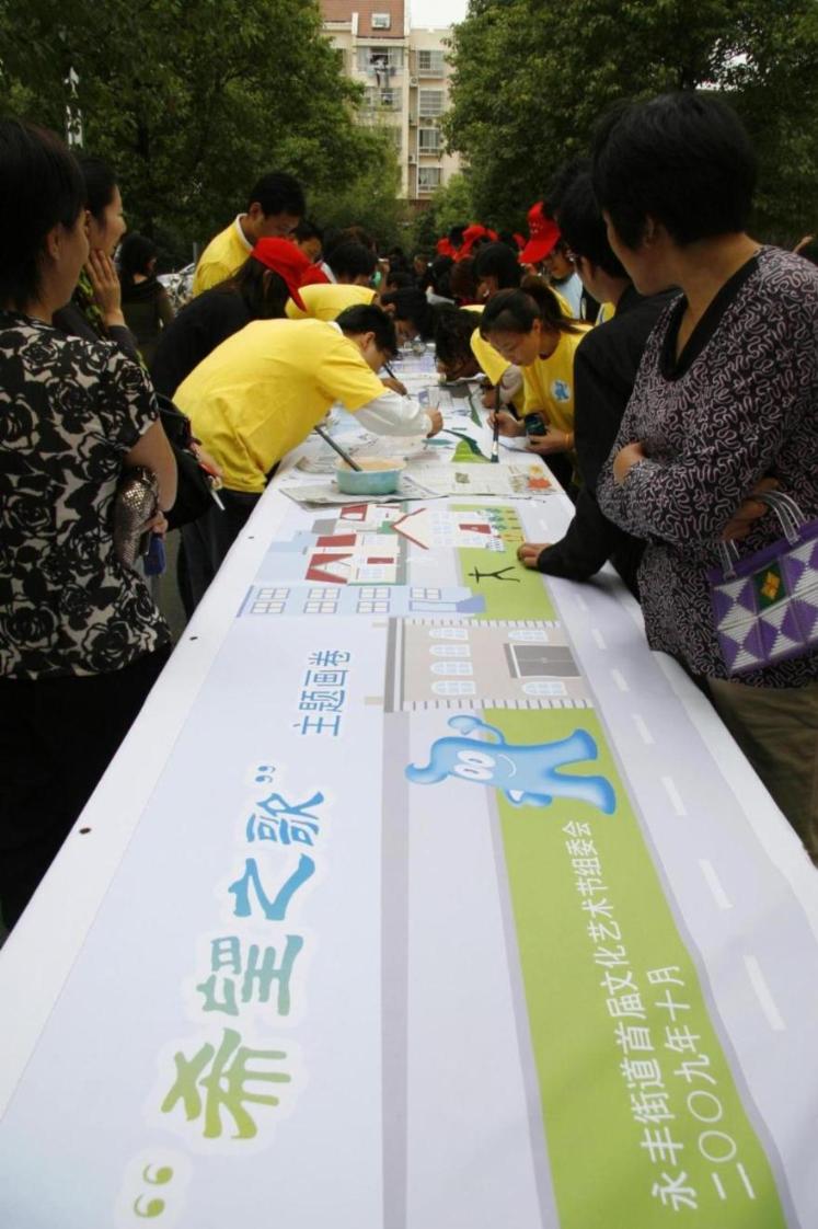 画卷的主题是“希望之歌”。学生志愿者们同永丰街道居委会的朋友们彼此间虽然不是太熟悉,但埋藏在心底深处的那份对世博的热爱之情使他们走到了一起。他们有的调配颜色、有的挥动画笔,相互帮忙、相互协作,配合的相当的默契。看似热闹欢愉的场面里,画卷的绘制丝毫没有搁置,反倒是有条不紊地进行着。参与活动的老师们也被活动热闹的气氛感染了,他们拿起画笔与学生志愿者们一起参与绘画。在大家齐心协作下,一张长达十米的画卷不一会儿就被色彩装饰的绚丽缤纷。最后,所有参加活动的师生们以合影的方式记录下这一值得纪念的时刻。