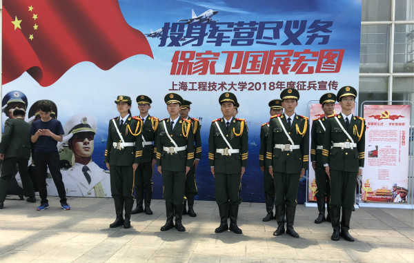 图说:2018年上海市征兵宣传进校园活动上午举行投身军营尽义务,保家卫国展宏图。市政府征兵办供图