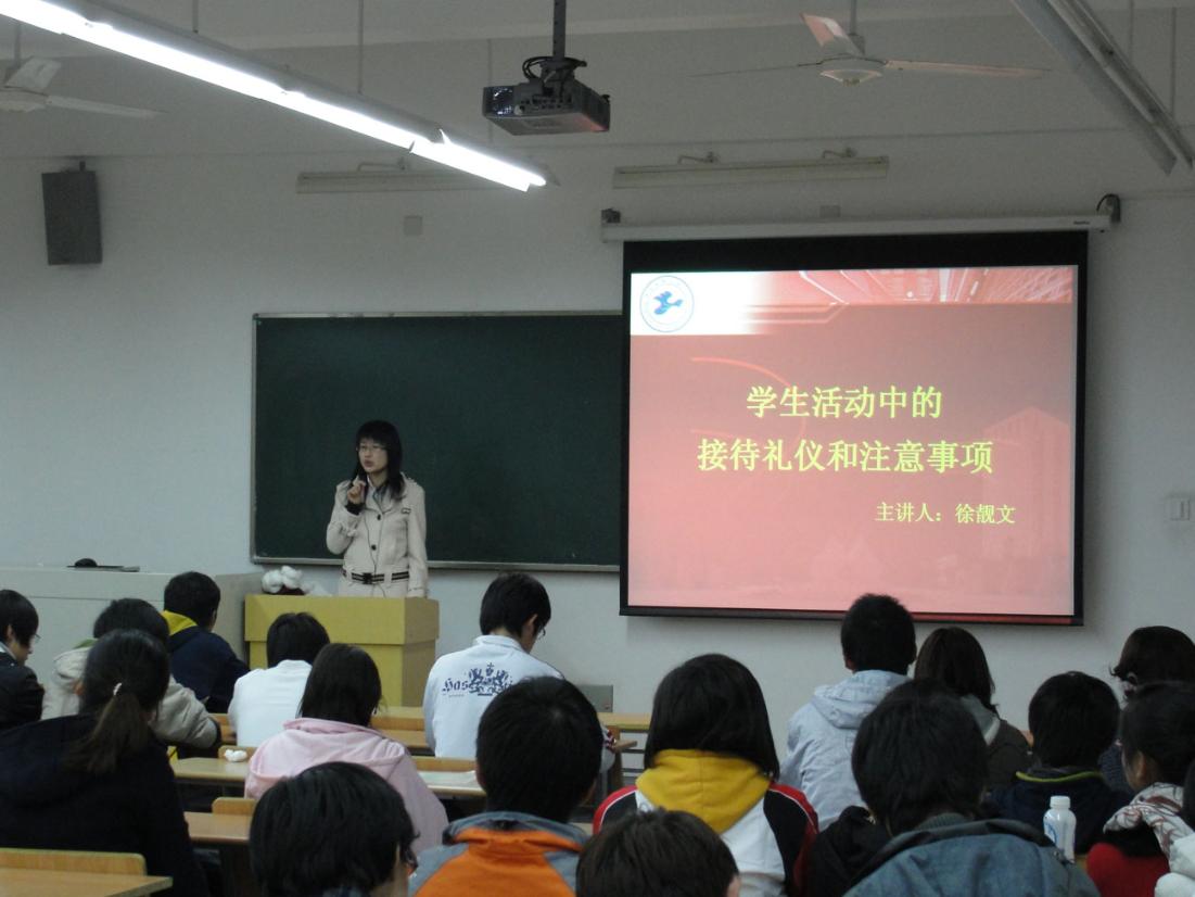 |  11月25日16:30,化学化工学院团学干部培训班第三次培训在教学楼E110室顺利举行。本次培训以“学生活动中的接待礼仪和注意事项”为主题,分别由郑晓昱、赵向敏、徐靓文三位同学为此次培训会作了专题演讲。  郑晓昱同学是05级高分子专业毕业生,曾担任校学生会主席,工作经验丰富。首先,她就干事们提出的问题谈了学生活动中接待礼仪方面应注意的事项,如:如何平衡学习与工作的方法、面对工作时的态度、以及干部应站在怎样的角度来衡量一件事物等,同时要求干事们要把学习放在首位,让干事们清楚地认识到工作与学习是不冲突的。 随后,大四学生赵向敏同学结合她在暑期中参加公司挂职锻炼的亲身经历,分别从工作技能、工作心态和人际关系三个方面详细讲述了干事们在今后工作中应注意的问题,并提出了很多中肯的建议。干事们表示听后对今后的工作更加信心满满。 最后,05级制药工程专业毕业生徐靓文同学就学生接待活动进行发言,她目前任职于学校校长办公室,专门负责接待礼仪方面的工作。发言中,她将平时工作中总结出的经验教训传授给大家,并列举了一些生活中常见的问题来说明接待礼仪的重要性。干事们也不时地响应学长的提问。整个培训会在轻松融洽的氛围中进行着。中场休息期间学院分团委学生会副主席带领大家做了一些小游戏,这些游戏既活跃了现场的气氛又增进了大家的默契。培训会在一片掌声中圆满落幕。 此次培训会,让干事们受益匪浅,在加强学院团学干部个人素养的同时,也提高了干事们接待礼仪方面的能力,明确了今后的工作目标,为他们将来更好地服务他人,服务祖国上了生动的一课。 分团委学生会