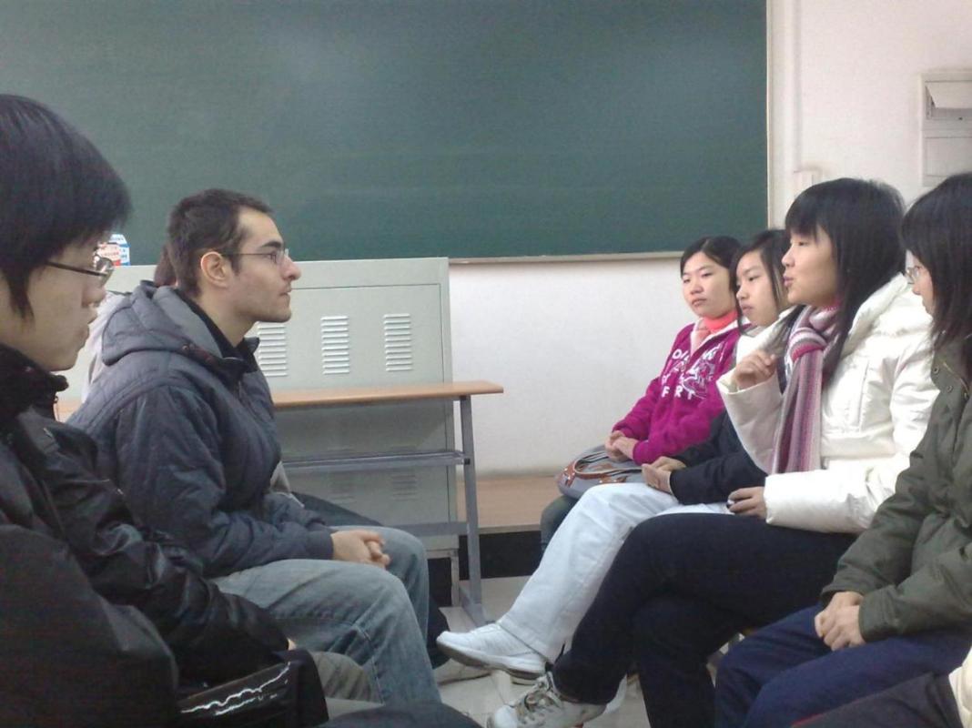 本次英语角活动以free talk 的形式聊天, 请来的外教是有着丰富经历的Josh。大家从即将到来的期末考试谈起,聊了 “About English class”、“Chinese teacher and western teacher”等许多内容。 在谈到“the country you want to go” 这个话题时, Josh以他丰富的阅历与同学们进行交流,并以一位聆听者和一位知心朋友的身份说出了他对这些国家的印象,令同学们深入了解了他。在Josh的引领下,同学们也畅抒己见,积极与Josh互动,纷纷道出了自己喜爱的国家和文化的认识,话语里流露出自己对未来的美好愿望。气氛也变得热烈起来。短短的35分钟很快就过去了,有的同学仍然意犹未尽,并向Josh要了联系方式以求以后能进一步与他交流、学习。 英语角活动作为学术部的一项传统活动,旨在提高同学们的英语口语能力,因此一直吸引着同学们的积极参与。世博即将拉开帷幕,许多同学想要成为世博志愿者的一份子,英语口语沟通能力必不可少,而每周的英语角活动正是提供了一个很好的机会。希望有更多的同学积极参与到这项活动里来。 | |