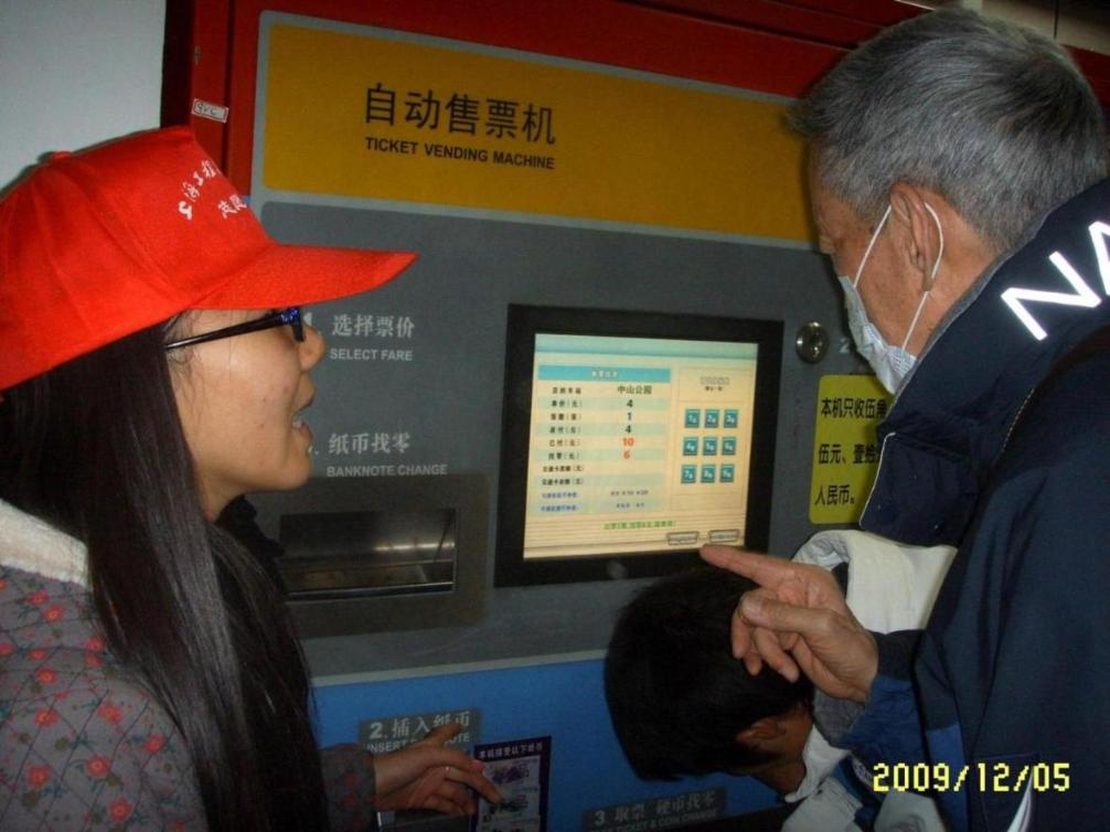 志愿者们分别在进站出站的闸机处和自动售票机处为有困难的乘客提供帮助。正直周末,在地铁站来往的人很多,需要帮助的人也很多。地铁志愿者们热情、耐心地教乘客买票,指引路标,为那些不知所措的旅客带来了方便,同时也在闸机口维持了良好的秩序。例如帮助乘客把行李搬过闸机,使排队的乘客减少等待时间;搀扶老人安全的进站等等。不仅如此,我们的地铁志愿者们也用流利的英文为外国友人提供了帮助,展示了上海这个国际化大都市的大学生文化素质水平。