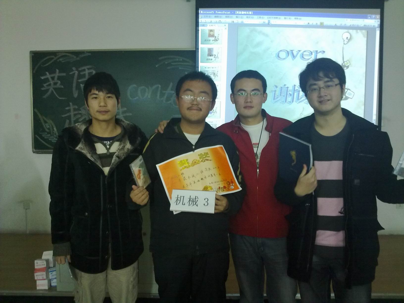 此次活动时间定于期末复习前期,据机械工程学院学生会学术部部长张军亮同学透露,这样的安排是为了在同学们期末复习阶段能激发同学们对英语知识的兴趣,在玩乐中学到对自己有用的知识。参赛人员由整个机械工程学院09级新生组成,分别为机械一、二、三班、装备一、二班以及能源一、二班。在之前全体大一新生参加类似的活动是很少见的,而大家也都在百忙的复习之余抽出时间来参与到这个充满趣味得比赛中。比赛一共分为四部分,分别是“速问速答”、“视听盛宴”、“趣味横生”以及“绕口令”。比赛中,同学们也表现得非常出色,特别是“视听盛宴”环节和“趣味横生”环节,几乎让全场气氛推向高潮,同学都沉浸在欢笑中。最后机械三班获得冠军,能源二班获得亚军,机械一班获得季军。
