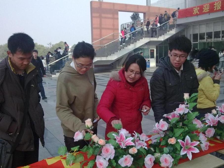 |  12月23日11:00,城市轨道交通学院社会实践部与园艺社在大食堂门口联合举办了“插花献祝福”活动,为城市轨道交通学院“五周岁”生日献礼。城市轨道交通学院分团委书记万慧琳老师与09及辅导员黄秀玲老师亲临现场。  社会实践部精心制作了一条印有“五年风雨,回首往昔峥嵘岁月;齐心协力,师生共谱城轨华章”字样的横幅,邀请同学们在纸质枫叶的背面写上自己对城市轨道交通学院建院五周年的祝福亦或自己的心愿,并在横幅上签名。大家积极踊跃的参与,短短半个小时,数米长的横幅上很快就写满了各式各样的签名,大家通过实际行动表达了自己的祝愿。同时现场一束束象征着学院常青的鲜花在横幅上“绽放”,同学们写满祝福的枫叶挂满了花茎,为娇艳的鲜花增添了几分美好。整个活动过程中,万慧琳老师不时地和周围同学交流了对本次活动的建议和看法,令同学们获益匪浅。最后两位老师也在横幅上留下了自己的祝福,本次活动圆满结束。 城市轨道交通学院历经风雨,走过了五个春夏秋冬,伴随着大家的祝福与期待,相信城市轨道交通学院的明天会更好!