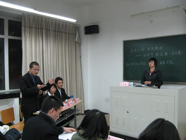 本次辩题新颖有趣、贴近我校大学生活,吸引了许多同学前来观看。其对阵双方为机械(正)VS管理(反),服装(正)VS化工(反),两场同时进行。 强手云集的半决赛赛场将辩题诠释的淋漓尽致。各参赛辩手或伶牙俐齿,或声情并茂,在针锋相对、唇枪舌战中坚持本方观点。实力强劲的四支队伍热情激昂的辩论,在诙谐幽默中暗藏玄机,为现场观众带来一次次精彩的视听享受,整场比赛高潮迭起,掌声络绎不绝。最终,机械工程学院、化学化工学院以微弱优势赢得了比赛的最后胜利,成功晋级总决赛角逐桂冠之位。 09读书节之第五届工程大辩论半决赛,不仅考验了辩手的辩论技巧从而提升自身能力,更从辩论过程中引发所有的人深思。接下来将是最引人注目的总决赛,相信那会更加精彩、激烈,让我们翘首以待!