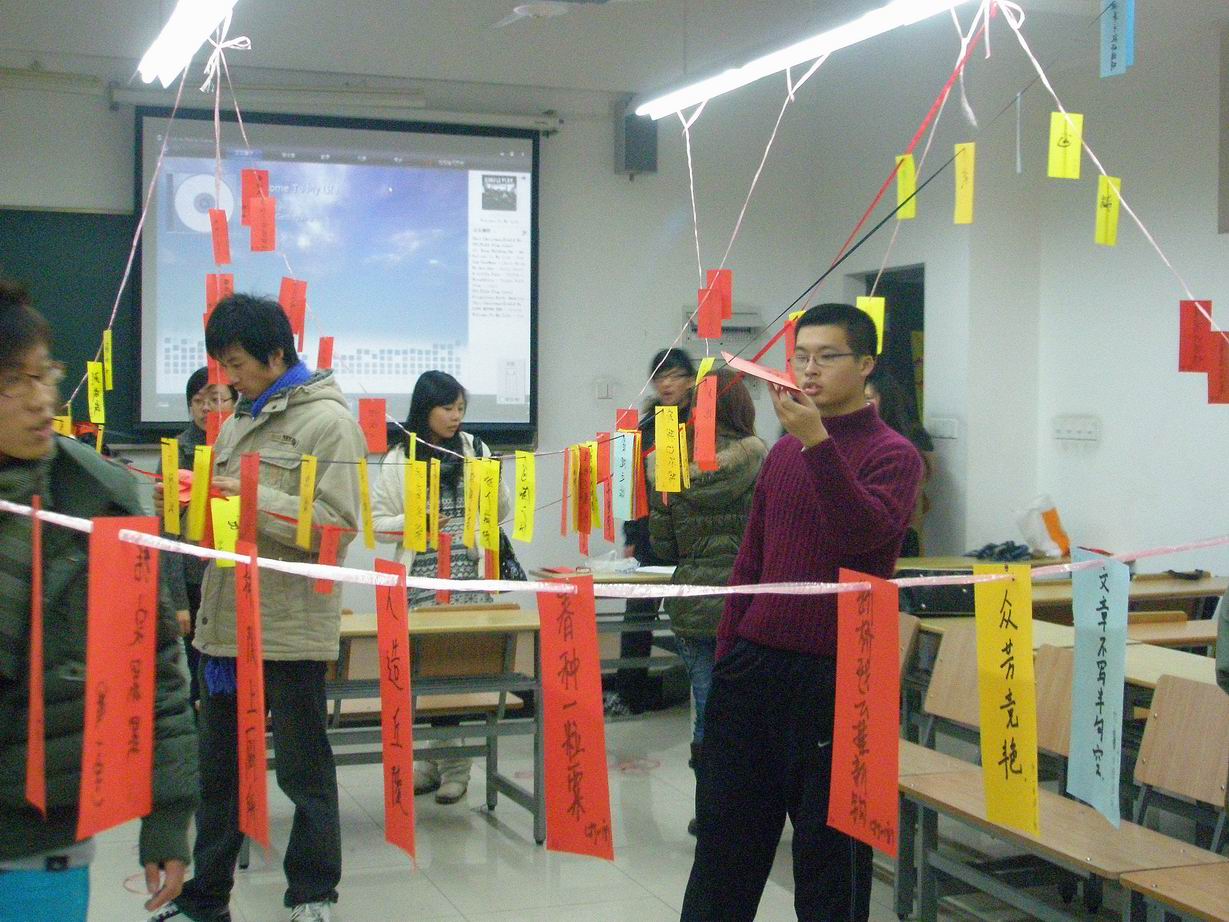 猜谜活动开始后,大家纷纷涌入活动会场,争先恐后地猜起谜语,现场气氛热闹非凡。大家拿出浑身解数,动员周边力量,有的在冥思苦想,有的猜中了谜语兴高采烈。同学们凭借着丰富的课外知识将难题一一解出,不一会儿功夫,本子、笔等奖品纷纷送到了同学们手中。整个猜谜活动在热烈的气氛中持续了一个多小时。 此次猜灯谜活动丰富了同学们的业余生活、充实了同学们的精神内涵,并且让同学们在愉快的氛围中度过了一个充满意义和乐趣的平安夜。 | |
