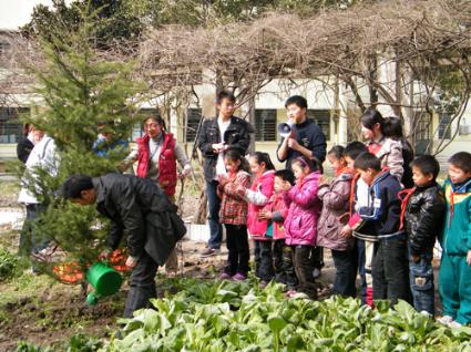 本次支教活动共包括两部分,其中12名支教组成员分别进入4个班级进行植树节主题课的教学。志愿者们介绍了植树节的起源与发展,强调了现如今保护环境的重要性,并且详细阐述了2010年绿色环保的世博理念。同学们积极踊跃发言,课堂气氛十分融洽。最后,大家在树叶形状的便利贴上写下了自己对上海世博会的祝福,一棵棵“世博小树”孕育而生,饱含了同学们童真而真挚的情意。与此同时,另外6名园艺社志愿者带领五十余名小学生在校园里进行现场植树活动,全面地展示了植树的整个过程,新桥小学张校长更是亲自为树苗填土。两棵青翠的小树寓意着大家对上海世博会的期待,同时也祝愿新桥小学的同学们伴着世博树的健康成长,能够学业有成。最后大家一起合影留念。 志愿者们离开时,孩子们依然在挥手道别,恋恋不舍。此类活动,不仅为小学生带去了知识,同时也令支教组的成员们得到收获与感悟,组长张羽成如是说:“你们感动了一群天使。”