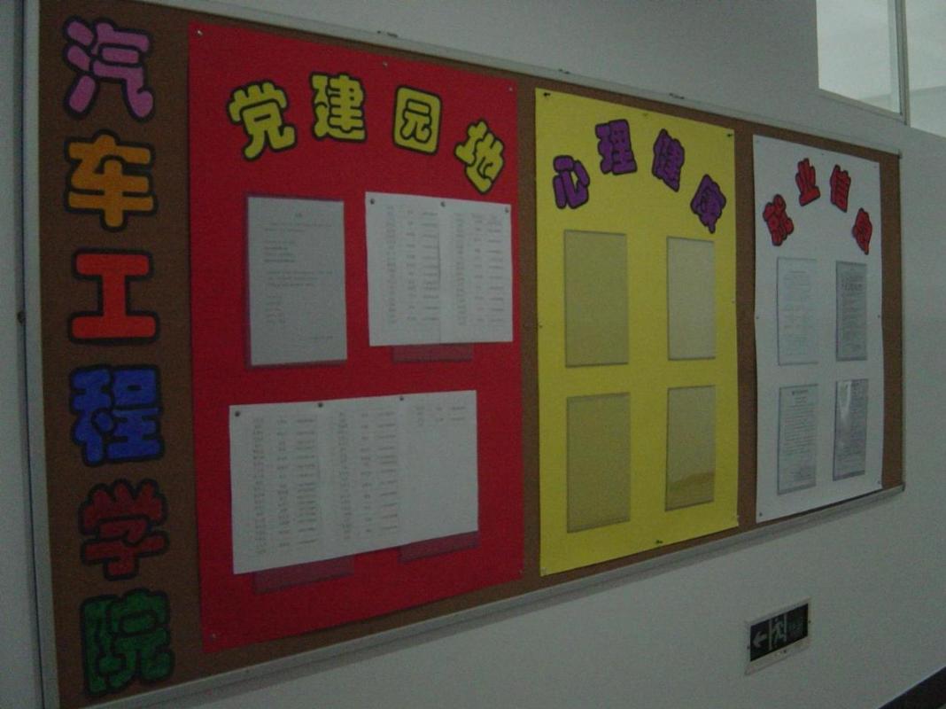 为配合学校迎接世博年和新的一学期的到来,3月14日,汽车工程学院将学院办公室门前的宣传栏重新布置。宣传栏是学院学生工作办公室对外交流的窗口之一,扮演着学院与同学们信息交流平台的重要角色。 此次重新布置,学院别出心裁地将面积有限的宣传栏分为了五个部分:党建园地、心理健康、就业信息、学生事务、团学联,井然有序地将学院各方面的动态清晰展现在同学们面前。师生们可以在宣传栏中了解近期学院将要展开的学生活动、各种招聘信息,及时了解学院动态。宣传栏俨然成为了学院的一道明丽的风景。 稿件作者:戴智鹏责任编辑:陈文琼