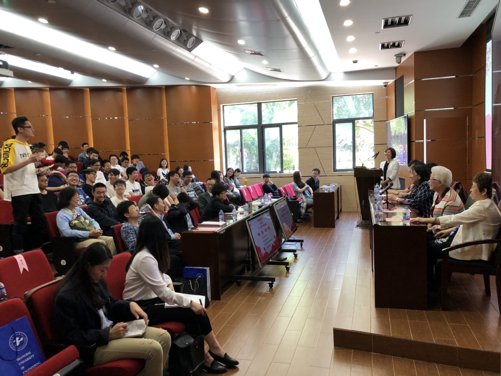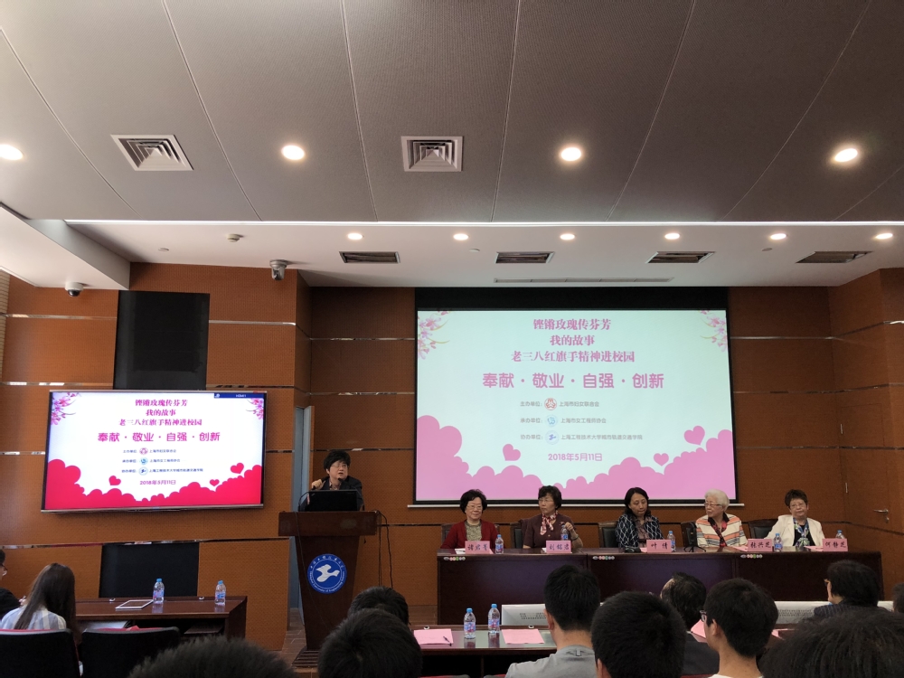 5月11日下午13:30在校松江校区航飞大楼6109学术报告厅济济一堂,“铿锵玫瑰传芬芳”关爱老三八红旗手活动之“我的故事”老三八红旗手精神进校园主题报告会在这里举行。出席此次报告会的有叶倩、刘铭君、张兴芝、何静芝、诸君菁五位演讲嘉宾,上海市妇女联合会第十四届、第十五届执委会委员、上海市女工程师协会会长、上海航天局纪委书记曲雁,上海市女工程师协会副会长、上海地铁第三运营有限公司党委书记、副总经理吴晓红,上海市女工程师协会副秘书长高健,上海工程技术大学校工会常务副主席柳如荣,上海工程技术大学城市轨道交通学院党总支书记柴晓冬,党总支副书记万慧琳以及全校200余名师生代表。此次主题报告会由上海工程技术大学城市轨道交通学院党总支副书记万慧琳主持。