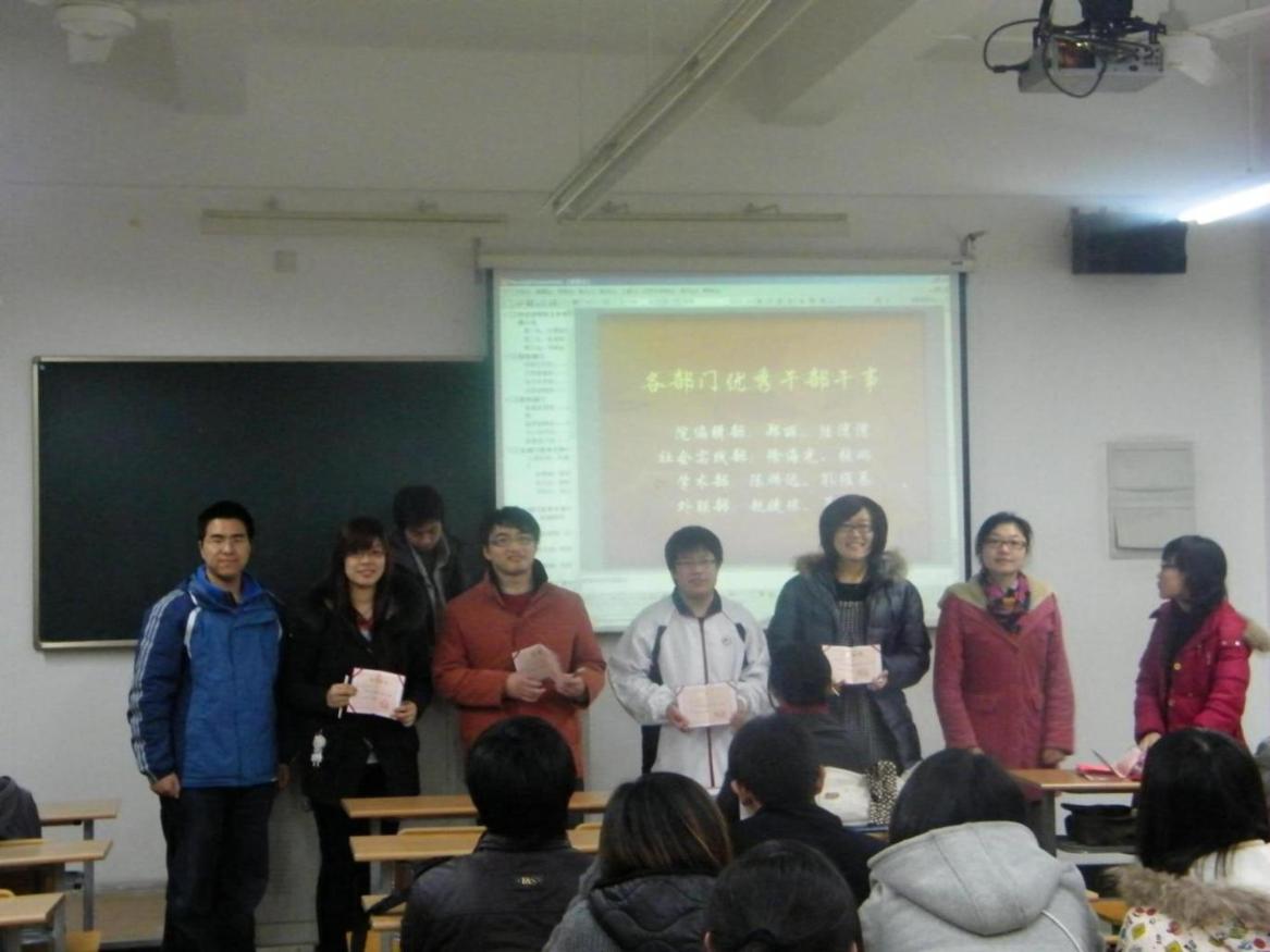 会议的第一项议程即对优秀部门及干事的表彰。首先是优秀部门的表彰。第一名是志愿者部,第二名和第三名分别由体育部和邓研部获得。随后又评出了各部门的优秀干事,平均每个部门两位同学获此殊荣。 会议的第二项议程是干部培训会,由院编辑部部长雷莹同学向大家讲解关于活动报道的注意事项与要点。比如得知新闻的途径、新闻的取材以及怎样抓拍到好的现场照片等等。在场同学皆受益匪浅。 会议在掌声中结束,这也是对上学期分团委学生会工作成果的肯定与鼓励。