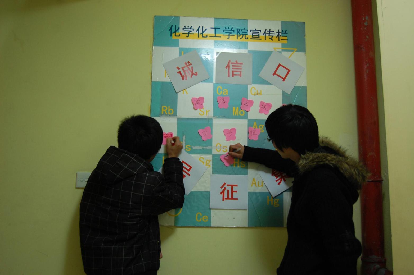 4月28日,化学化工学院学生会生活部在寝室楼举行了诚信口号征集活动。学院学生积极参加,将自己的诚信诺言签于纸上。同学们在写下诚信口号的同时也表示,在未来世博志愿者服务期间将恪守诚信,为前来的海内外来宾展示上海大学生最良好的一面。 稿件作者:徐朱琛责任编辑:陈文琼