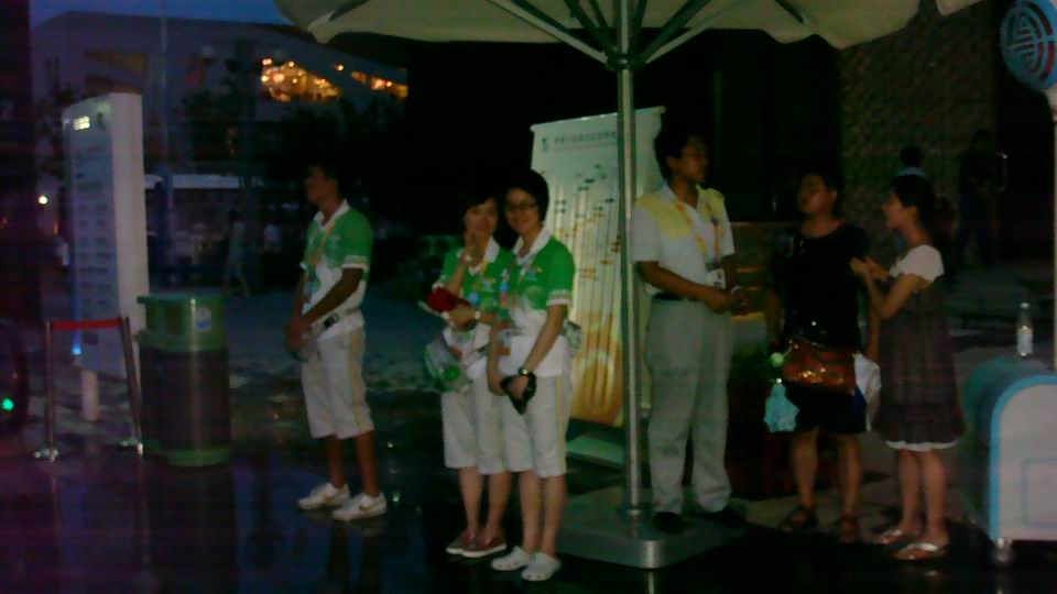 8月15日,连续4天的高温天气终于停止了肆虐。下午,世博园区发布了雷电黄色预警信号,伴有八级大风,在为园区消暑的同时给服装学院室外岗的志愿者们带来了极大的困难,让“高温岗”变成了“风雨岗”。 但我们的志愿者们没有退缩,在没有伞的情况下在风雨中坚持站岗,为游客解答问题、解决困难,让小白菜的身影总能在游客们的眼前闪现,让他们知道,我们一直在身边。服装志愿者们的精神深深鼓舞了我们的同学,大家纷纷表示,必将拿出更大的勇气与毅力去工作! 稿件作者:蒋与杰责任编辑:陈文琼