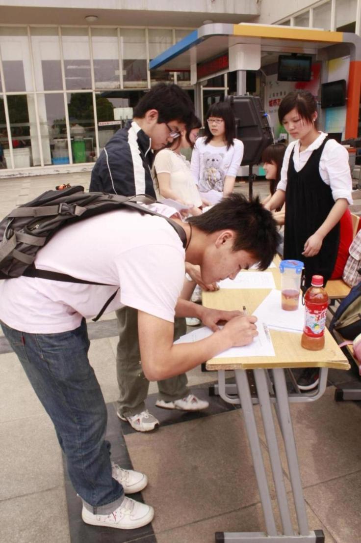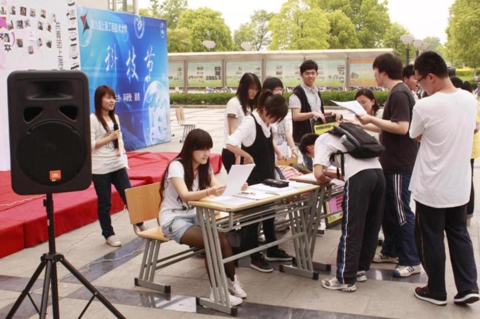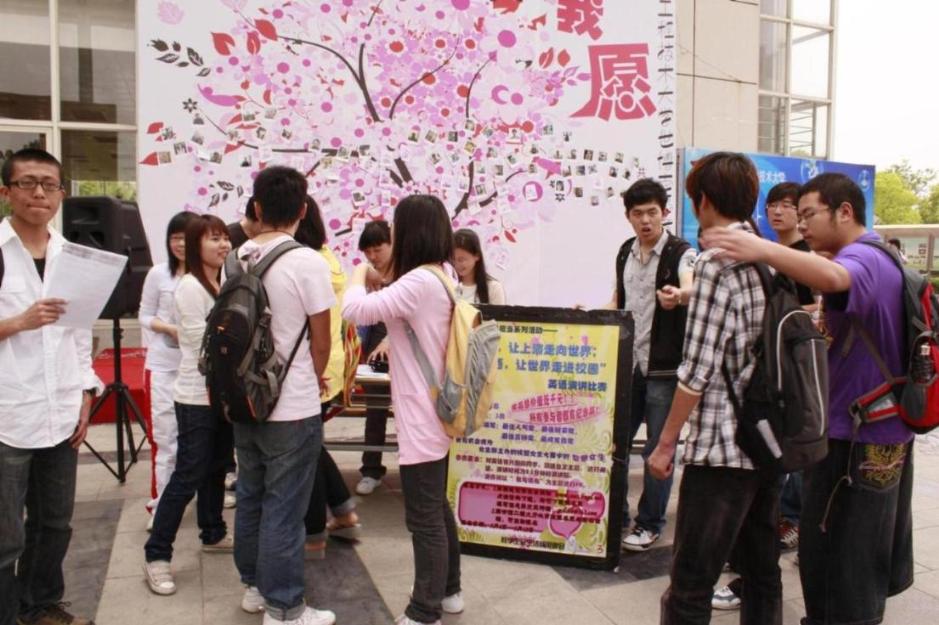 在动感欧美歌曲的伴随下,英语演讲报名正式开始,工作人员在川流的人群中开始发放传单。本次活动还邀请了我校“唱响世博”外文歌曲获奖选手现场献歌,麦克摇滚的经典歌曲——TAKE ME TO YOUR HEART,吸引了不少驻足欣赏的同学。在工作人员的耐心讲解和极力鼓励下,许多愿意一试的同学在报名处填写了自己的个人信息并进行报名。