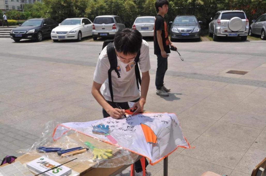 此次活动分为两个部分——签名和制作。风筝制作历来是一项趣味盎然的活动,也是中华民族优秀的非物质文化遗产精髓。扎制风筝其实是一件非常有趣的事,也有许多的讲究和窍门,用来做骨架的竹签必须用温水泡过后在火上烤成弧形,这样的风筝才不容易折坏。听着风筝社社员们的精彩讲解,在场的同学们都跃跃欲试。在社员们的的指导下,同学们开始为风筝的外形剪裁作画,最终经过1个多小时的努力,一个个细致的三角风筝呈现在我们的面前。 下午13:00活动圆满结束。不少同学表示,像这样展现中华民族传统手工艺的活动应该在大学校园中普及,让更多当代青年了解和认识博大精神的中国文化。 | |