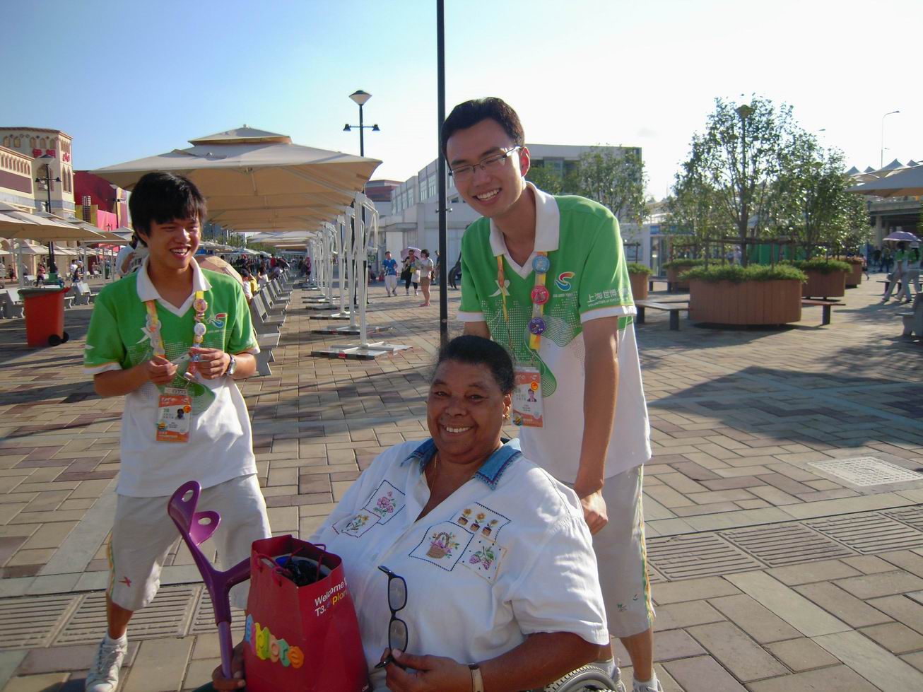 老妇人Mandy在电气学院“小白菜”雷延、方晨杰与马俊杰三位志愿者的帮助下坐上了轮椅,准备前往中国馆附近的5号出口。因为“小白菜”们阳光般的笑容与周到的服务,Mandy小腿的疼痛得到了缓解,也开始与三位志愿者亲切交谈。谈笑间,Mandy为今天能遇到如此专业友好的志愿者而感到高兴。她谈到,由于热爱中国文化,一直希望能够亲自来中国走走,但因为体重负担过大而无法圆自己的“中国梦”。这次上海举办世博会,老人感到不能再次拖延自己前往中国的梦想,于是不远万里来到上海,希望自己能有一次美好的世博游,可却因为最近小腿旧伤复发,拄着拐杖的她仍然坚持游园。 虽然最后因病痛而摔倒,但Mandy并不遗憾,因为她真实地体会了中国志愿者的优秀。听着老人款款而谈,看着老人恋恋不舍地一路拍照留恋,三位志愿者十分感动,特地赠送“上海工程技术大学志愿者”徽章留作纪念,Mandy也饶有兴致地用并不流利的中文读出“上海工程技术大学”这句中文,小小地秀了一下自己的中文,旅途很愉快三位志愿者很快推着Mandy来到园区门口。 Mandy依依不舍地乘坐出租车离开了世博园,小白菜们望着这位热爱中国文化,热爱世博会的美国老人,深深地体会到志愿者对于世博的重要,他们的一举一动都影响着这些向往中国、想要了解中国文化的外国游客。志愿者同样是世博会向世人展示的一部分,能够成为这沟通世界的桥梁,电子电气工程学院的小白菜们感到无比自豪。 | |