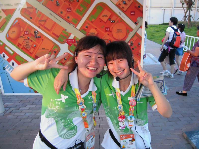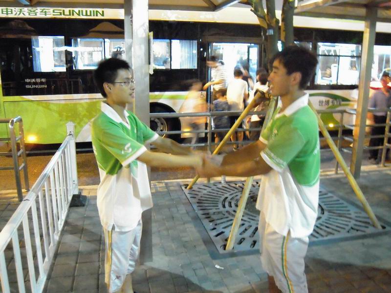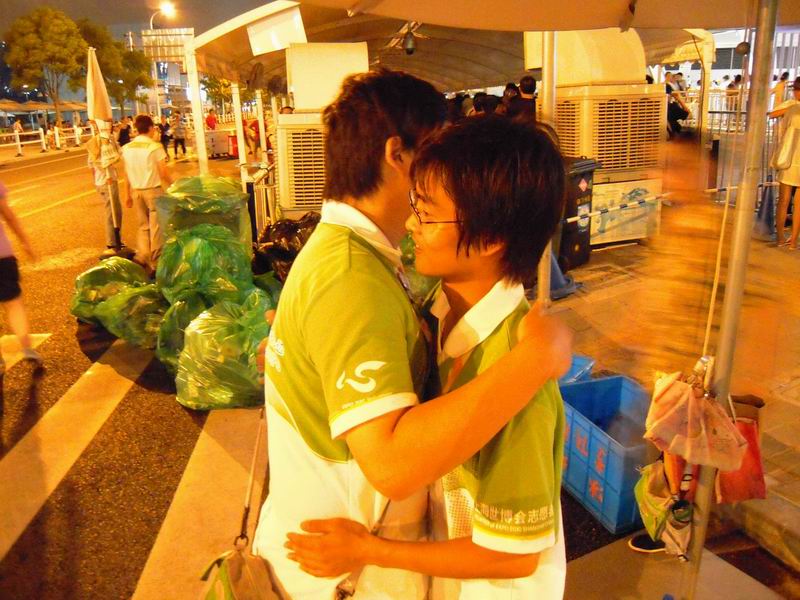 程程们曾怀着一份圣神的使命感走进世博园区,走上自己的岗位;现如今日复一日的过去,“小白菜”的称号逐渐走向“老白菜”。 电气程程即将告别盛大的世博园,告别忙碌的岗位,告别问询的游客,大家心中除了轻松感,更多的是不舍。很多岗点换岗时,程程们自发与两周来朝夕相处的兄弟姐妹们热情地握手和拥抱,留住那美好的记忆。 有程程拍着来接他下一班岗的兄弟说:“倒数第二天了,同学。”“对啊,我真想一直呆在这儿,为游客提供信息服务,真的很开心,明天就结束了还真不习惯,不穿白菜装没人来问我了” 话语中对世博园那份深深的感情逐一显露。两棵白菜激动地握在一起,说:“志愿者就要结束了,记得以后在路上遇到了要打招呼啊,先合张影吧,”相机记录了这一刻。