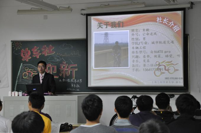 18:00大会准时开始,首先由现任单车社社长曹立翔介绍社团发展历程。上海工程技术大学单车社成立于2006年10月1日,由一群自行车爱好者创办。社团口号是“只要你有自行车,我们就能带你去你想去的任何地方!”,这足以表明社团成员的决心和“有梦想就有可能”的信念。另外单车社还连续两年被学校社团联合会评为“四星级社团”。最后,曹立翔将社团“接近自然,接触社会,结交朋友”的宗旨结合照片、视频等全方位诠释给了社员。 在互动环节中,单车社四任社长以及兄弟社团的代表轮番走上讲台,谈了谈单车社在过去四年里举办过的活动以及活动中的有趣见闻。单车社创始人曾联讲述了去年清明骑车去天荒坪的经历——他们见到了只有电影里才有的风景,忍受了深夜骑行在山路上的恐惧,也经历了走错山路,不得不返回的绝望,但当他们到达山顶时,“一切的不顺心都化作眼前最美的景色”。他们不畏艰难的精神赢得了社员们阵阵掌声。 最后,现任社长曹立翔重点讲述了单车社未来的发展规划。即社团将组建自己的管理团队,使得单车社朝着专业化、规范化的道路发展,打造高品味社团,将校园社团文化推向一个新的高度。 | |