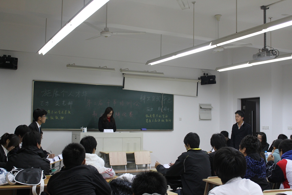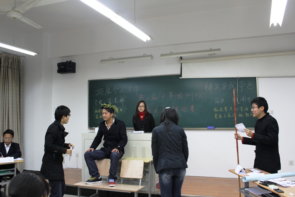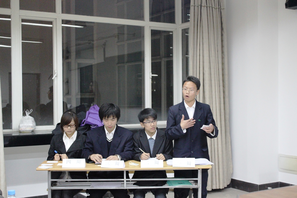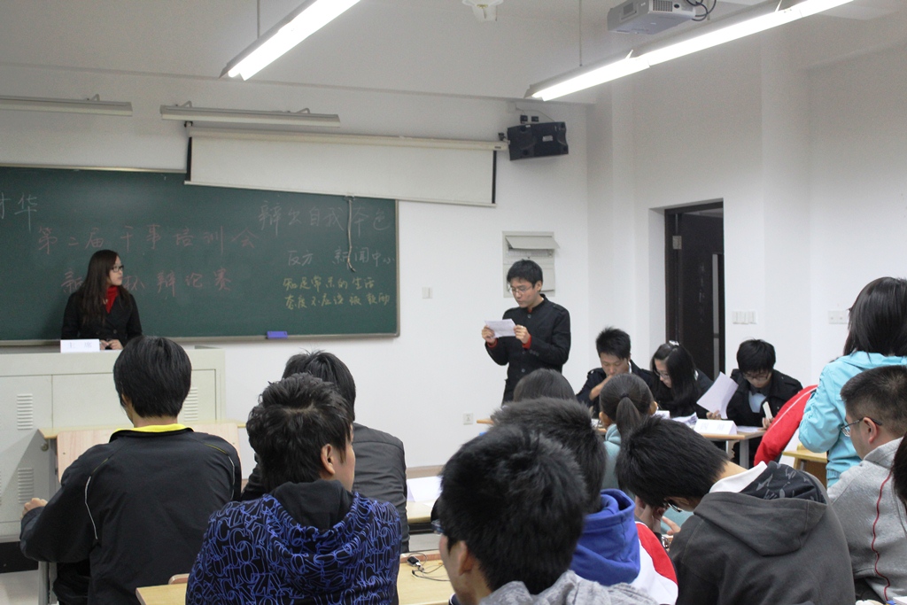 本场比赛分为六组,宣传部对阵学术部、办公室对阵社团部、网络部对阵体育部、文艺部对阵新闻中心、外联部对阵生活部、志愿者部对阵素拓部。其辩题分别为“天灾可怕还是人灾可怕”、“ 张扬个性利于社会进步还是遵守规律有利于进步”、“人生中结果和过程中哪个更重要”、“知足常乐的生活态度是否该被鼓励”、“当代大学生是否应该住读”和“孩子应当穷养还是富养”。 本届辩论赛不同往日,新增了表演环节。在此环节辩手们可以尽情发挥想象力,编排出能够证明自己观点的小品,看似娱乐的表演却隐藏深意。预热活动过后,初赛正式开始。开篇陈词环节,正反双方都直截了当地亮出本方的观点并加以事例证明。精彩陈词原来是抛砖引玉,攻辩环节双方互不相让,辩手们总能在对方看似严密的论述中找到漏洞并予以反驳。自由辩论环节更是高潮迭起,辩手们不仅提问犀利,回答更是漂亮。而最后的总结陈词则让大家感受到了辩手们沉着冷静的一面。台上辩手们表现出众,台下观众也是热情高涨,不时爆发出阵阵掌声。 比赛在热烈的气氛中圆满结束,经过评委评判,学术部、办公室、网络部、新闻中心、外联部和素拓部“杀”进了复赛。尽管比赛中火药味十足,但正反双方仍坚持“友谊第一”的比赛原则,在赛后互相握手留影。 辩论赛初赛结束了,但大家都意犹未尽,已经开始期待复赛的精彩。 | |